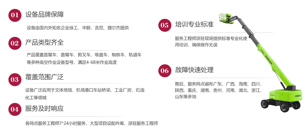 公司在發(fā)展歷程中堅定實行大客戶戰(zhàn)略,致力于以優(yōu)質(zhì)的服務(wù)打造公司的品牌和核心競爭力,現(xiàn)已在廣東、廣西、海南、四川、陜西、湖南、重慶、河南、湖北、貴州等多地建立了完善的售后服務(wù)網(wǎng)點,24小時為客戶排憂解難。今后我們將結(jié)合市場需求,不斷創(chuàng)新業(yè)務(wù)模式、優(yōu)化設(shè)備結(jié)構(gòu)、加強運營管理、擴大服務(wù)網(wǎng)點、提升服務(wù)水平,形成以設(shè)備租賃、銷售、二手設(shè)備交易等全方位一站式的全面服務(wù)體系,用高標(biāo)準(zhǔn)高質(zhì)量的服務(wù)讓客戶在和公司合作的過程中實實在在感受到省心、省力、省錢的體驗,在客戶心目中樹立“家鋒”的品牌形象。